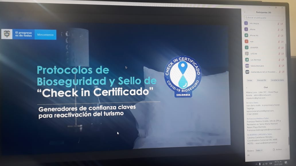 Con el fin de dar a conocer a los prestadores de servicios turísticos los conceptos básicos, importancia, procedimiento y beneficios del sello de Bioseguridad Check In certificado expedido por la resolución 0576 del 27 de mayo de 2020 del Ministerio de Comercio, Industria y Turismo, en coordinación con personal del MinCIT, del Organismo Nacional de Acreditación – ONAC y el Instituto Distrital de Turismo INDETUR, se realizó el conversatorio “CHECK- IN CERTIFICADO, COVID 19 BIOSEGURO”