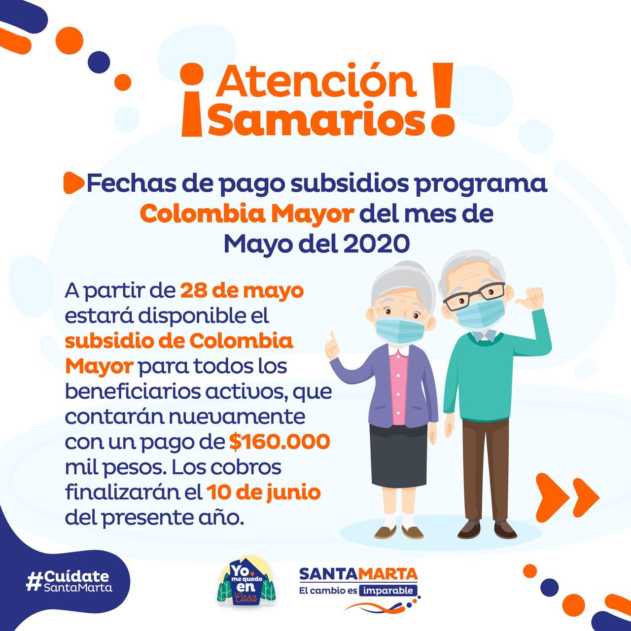 Una vez girados los recursos a los beneficiarios del programa Colombia Mayor por parte del Gobierno Nacional, la Alcaldía Distrital, a través de la Secretaría de Promoción Social, informa sobre el inicio a los esquemas de pago del subsidio correspondiente al mes de mayo 2020.