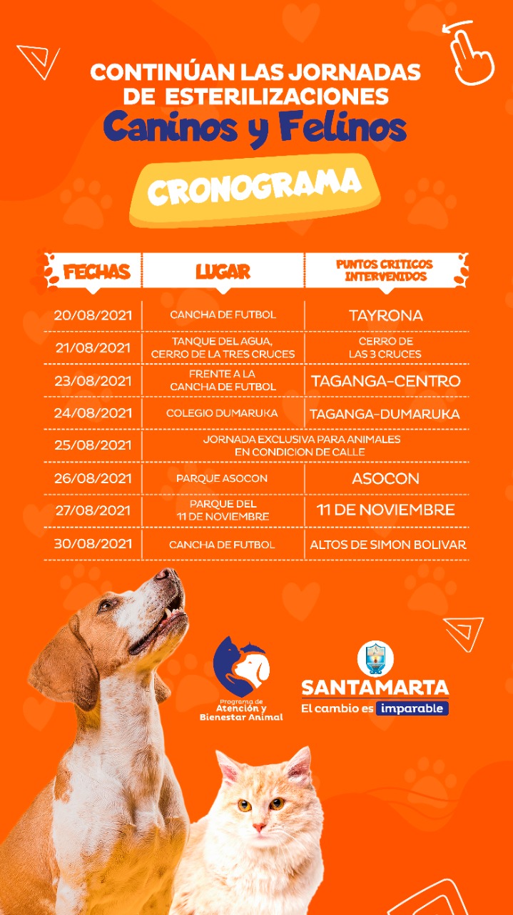 El cronograma de las Jornadas Masivas de Esterilización para caninos y felinos sigue el 23 de agosto en Taganga- Centro; el 24 de agosto en Taganga- Dumaruka; el 25 jornadas exclusivas para animales en condición de calle; el 26 en el barrio Asocom; el 27 de agosto en el 11 de Noviembre; el 30 de agosto en Altos de Simón Bolívar; el 31 de agosto en Las Malvinas; el 1 de septiembre en el barrio 8 de Febrero; el 2 de septiembre en el Boulevar del Río y el 3 de septiembre otra jornada exclusiva para animales en condición de calle.