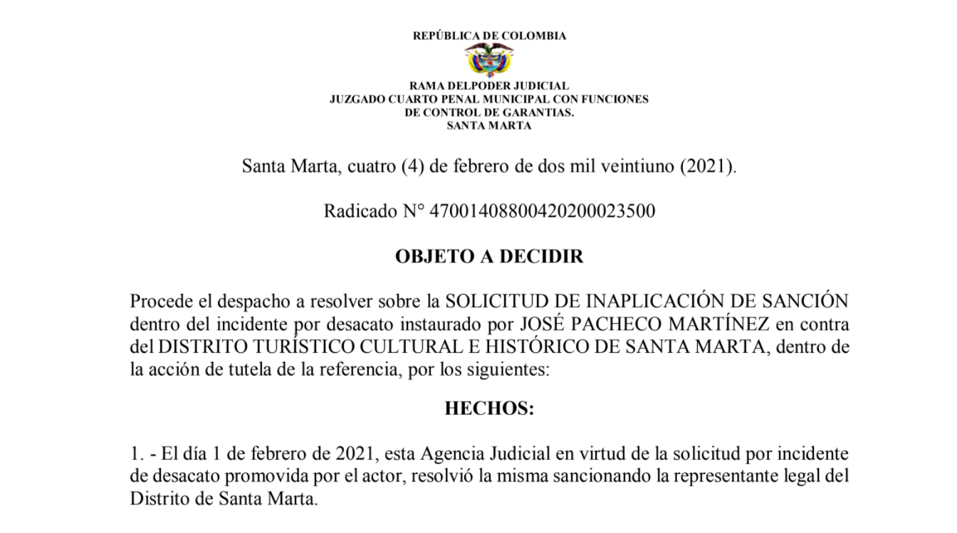 - Rama del Poder Judicial - Juzgado Cuarto Penal Municipal con funciones de control de garantias Santa Marta - Radicado No 47001408800420200023500: resolución sobre la SOLICITUD DE INAPLICACIÓN DE SANCIÓN dentro del incidente por desacato instaurado por JOSÉ PACHECO MARTÍNEZ en contra del DISTRITO TURÍSTICO CULTURAL E HISTÓRICO DE SANTA MARTA, dentro de una acción de tutela.