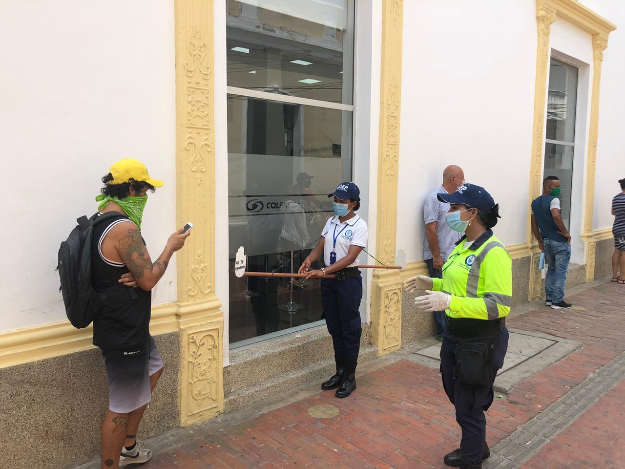 Mediante el uso de un novedoso método, la Alcaldía de Santa Marta, a través de la Secretaría de Gobierno Distrital y la Unidad Defensora del Espacio Público (UDEP), se tomaron la zona bancaria del Centro Histórico de la ciudad, en desarrollo de una campaña pedagógica que busca que los samarios cumplan el distanciamiento y así evitar aglomeraciones a las afueras de las entidades financieras.