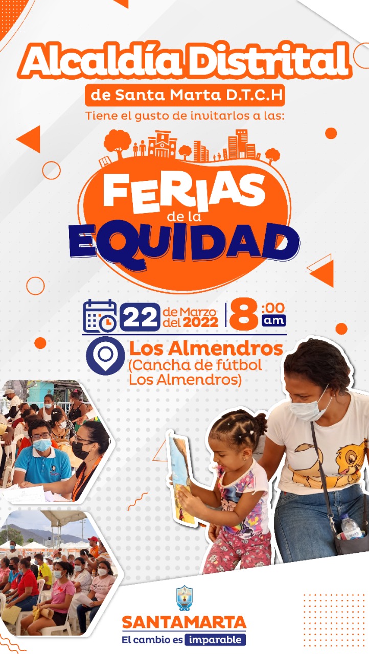 La Alcaldía de Santa Marta invita a los habitantes del barrio Los Almendros y sus alrededores, a participar de las Ferias de la Equidad que se realizarán este 22 de marzo a partir de la 8 a m, en la cancha de futbol del barrio Los Almendros.