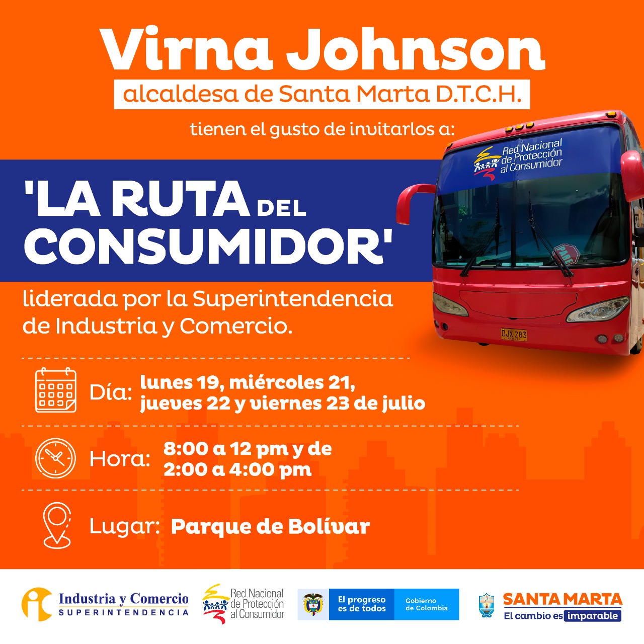 La alcaldesa de Santa Marta D.T.C.H. Virna Johnson, invita a todos los samarios a que asistan a la jornada de atención que se brindará por parte de la Superintendencia de Industria y Comercio denominada ´Ruta al Consumidor´, la cual tiene como propósito fundamental difundir y proteger los derechos de los usuarios.