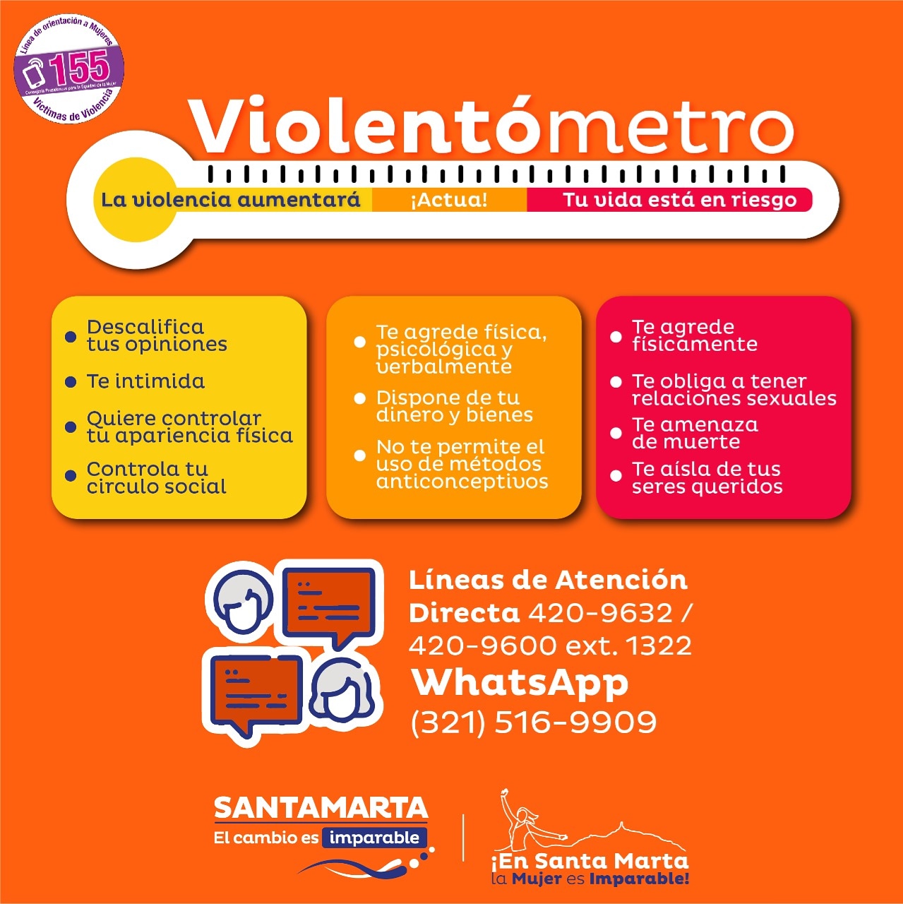 Así mismo, la Alcaldía Distrital les recuerda que los colores del violentómetro representan las alertas de mujeres agredidas para que no se queden calladas y denuncien a tiempo la situación que estén viviendo o el caso que conozcan, en aras que las autoridades en el Distrito puedan actuar oportunamente.