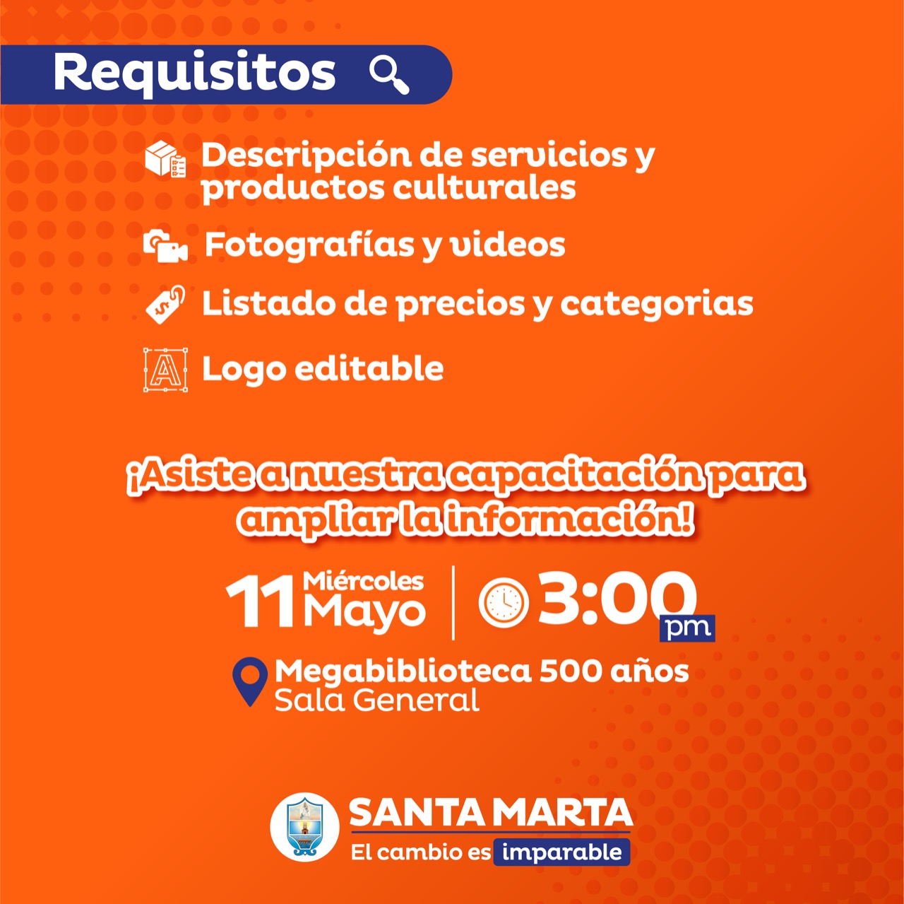 Los interesados en ser parte del Marketplace deberán enviar al correo electrónico: cultura [at] santamarta.gov.co su portafolio de servicios con los siguientes requisitos: Descripción de servicios y productos culturales, fotografías y videos, logo editable, listado de precios y categorías.