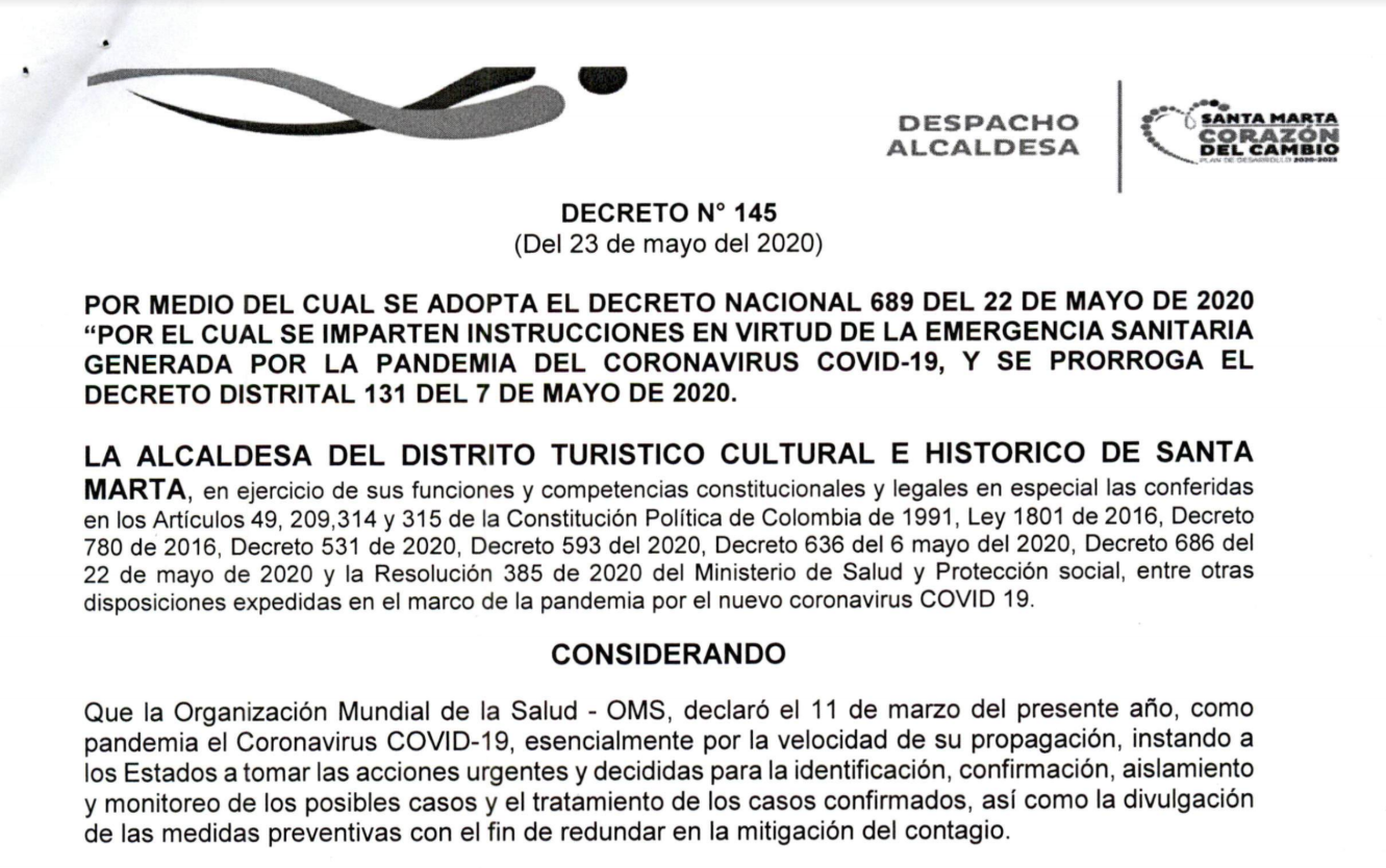 La Alcaldía de Santa Marta expidió el Decreto 145 del 23 de mayo de 2020, por medio del cual se imparten instrucciones en virtud de la emergencia sanitaria, generada por la pandemia del coronavirus Covid-19 y se prorroga el Decreto Distrital 131 del 7 de mayo de 2020.