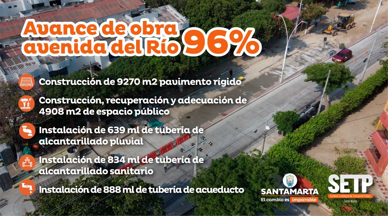 Dando continuidad a los compromisos adquiridos por la alcaldesa Virna Johnson, el Sistema Estratégico de Transporte Público de Santa Marta, ha avanzado con gran satisfacción en el desarrollo de las obras del tramo 3 de la avenida del Río, las cuales presentan una ejecución del 96%, contempladas en las siguientes actividades constructivas.