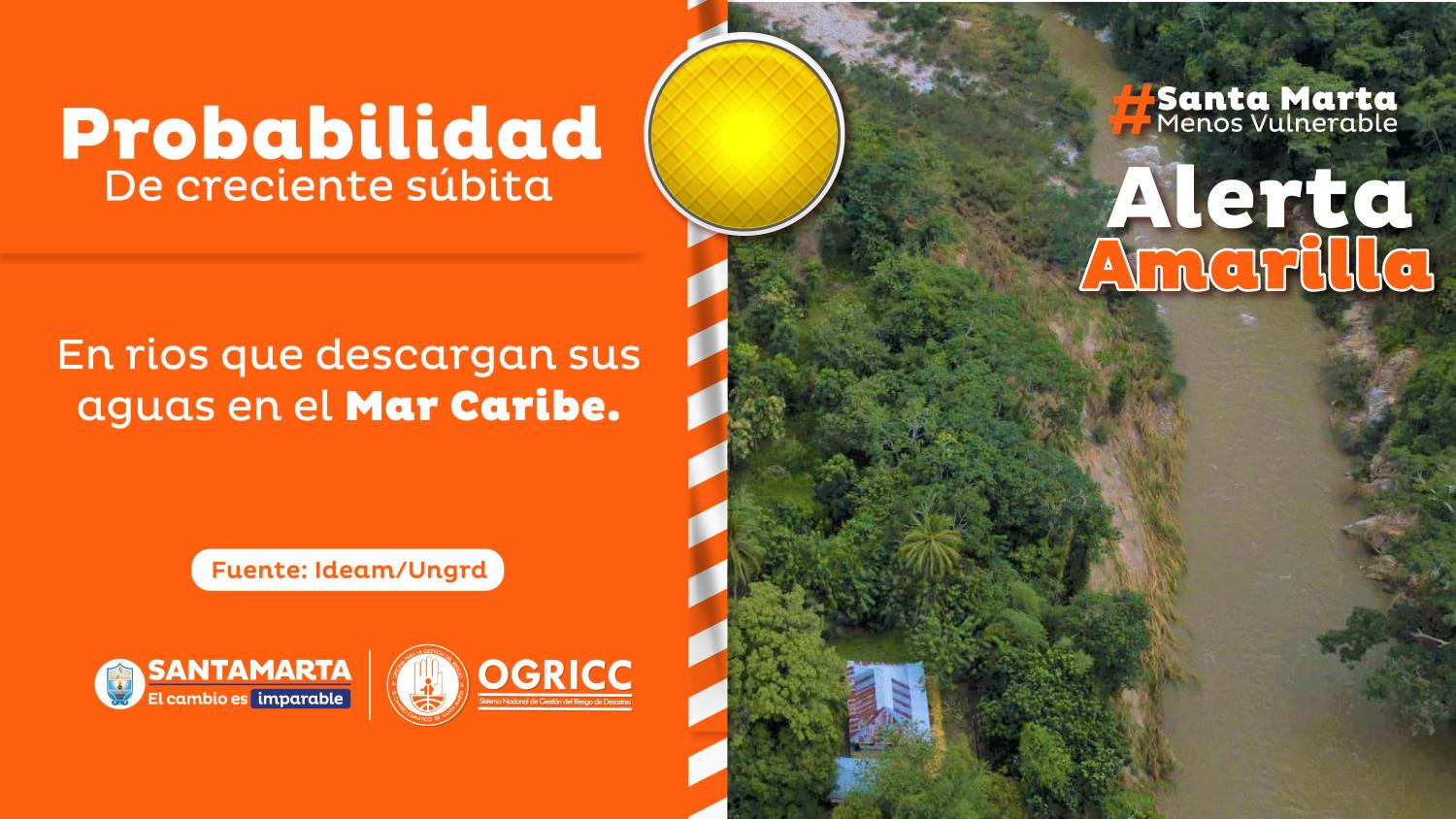 De acuerdo con la información entregada por la Ogricc, esto coincide con la emisión de una alerta amarilla por probabilidad de incrementos súbitos en los ríos Piedras, Manzanares, Guachaca, Mendihuaca, Buritica, Don Diego y sus afluentes aportantes, que descargan sus aguas al mar Caribe. De igual forma, se sostiene la alerta naranja por amenaza de deslizamientos de tierra en zonas de ladera y alta pendiente del territorio.