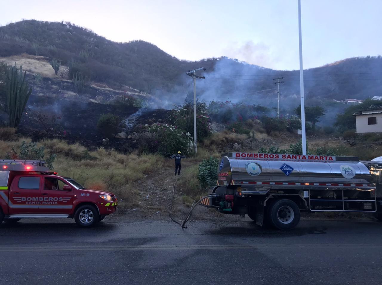 En total, fueron atendidos cuatro incendios con apoyo de los voluntarios del Cuerpo de Bomberos de Santa Marta, en barrios como Ciudad del Sol, María Eugenia, Gaira y el corregimiento de Taganga.
