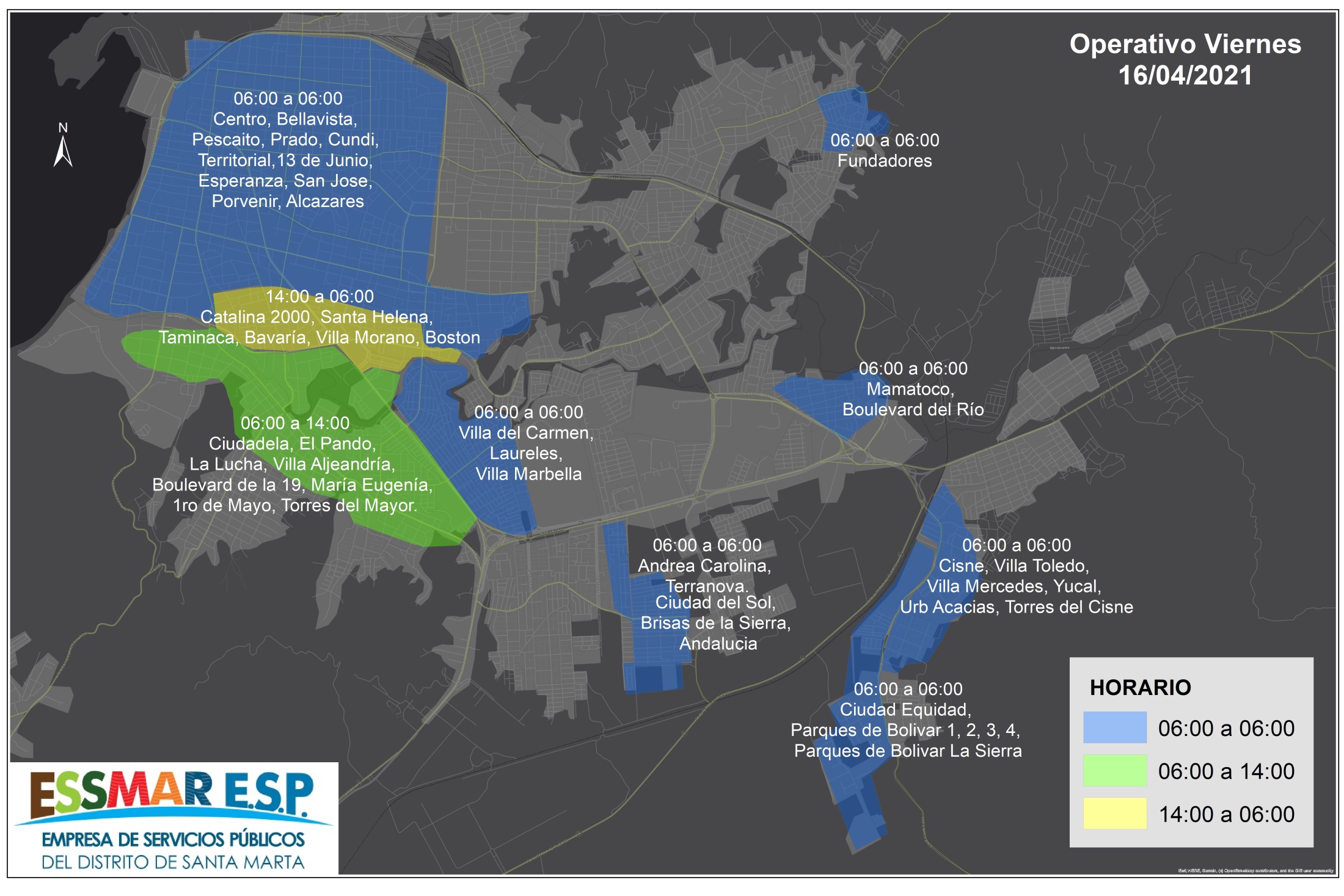 La Empresa de Servicios Públicos del Distrito de Santa Marta, ESSMAR E.S.P., desde su área de Acueducto, informa a la opinión pública y a la ciudadanía en general que hoy viernes 16 de abril se llevará a cabo el operativo de distribución de agua en distintos barrios de la ciudad.