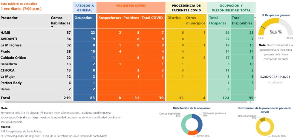 La Alcaldía Distrital de Santa Marta, a través de la secretaría de Salud y la revisión del tablero de control, continúa realizando monitoreo permanente al comportamiento de la pandemia. Pese al aumento de los contagios en las últimas semanas por la presencia de la variante Ómicron en la ciudad y el país, actualmente, la ocupación de las Unidades de Cuidados Intensivos en la capital del Magdalena es moderada.