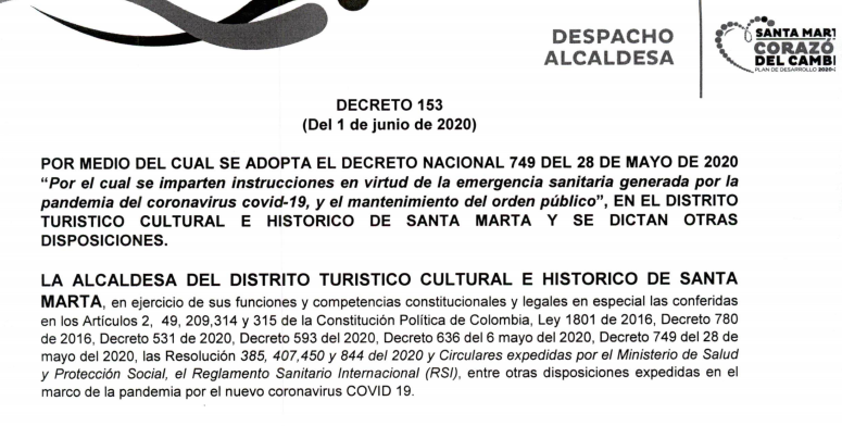 - Decreto No 153 del 1 de junio de 2020: "Por medio del cual se adopta el Decreto Nacional 749 del 28 de mayo de 2020 <<Por el cual se imparten instrucciones en virtud de la emergencia sanitaria generada por la pandemia del Coronavirus COVID-19, y el mantenimiento del orden público>>, en el Distrito Turístico, Cultural e Histórico de Santa Marta y se dictan otras disposiciones"