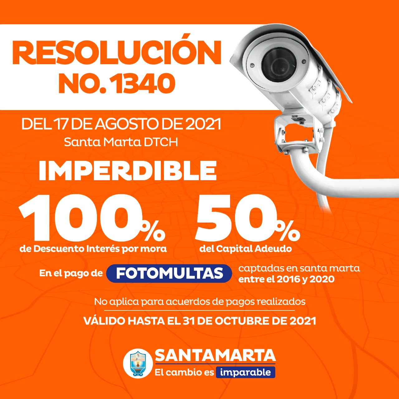 Hasta el próximo 31 de octubre estará vigente la Resolución 1340, del 17 de agosto de 2021, por medio del cual se establece el 100% de descuento de intereses por mora y el 50% del valor de las infracciones de tránsito captadas por medios técnicos y/o tecnológicos en la ciudad de Santa Marta, a la que podrán acogerse quienes tengan cuentas pendientes con este organismo de tránsito.