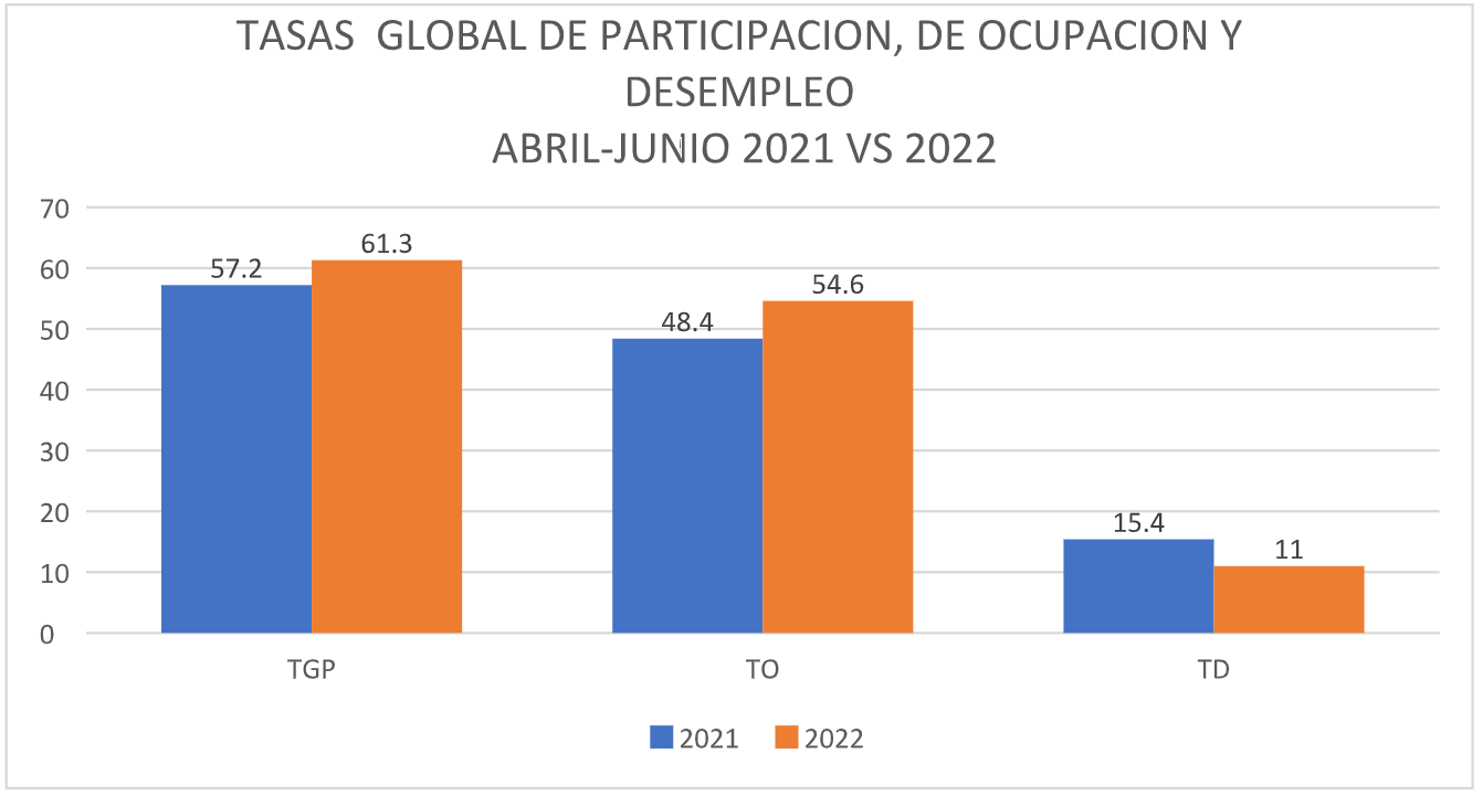En cuanto al mes de junio de 2022, la tasa de desempleo fue 11 %, la tasa global de participación llegó al 63,7% y la tasa de ocupación se ubicó en 56,7%. En ese mismo mes pero del año 2021, estas tasas fueron 15,1%, 61,2% y 52,0%, respectivamente.