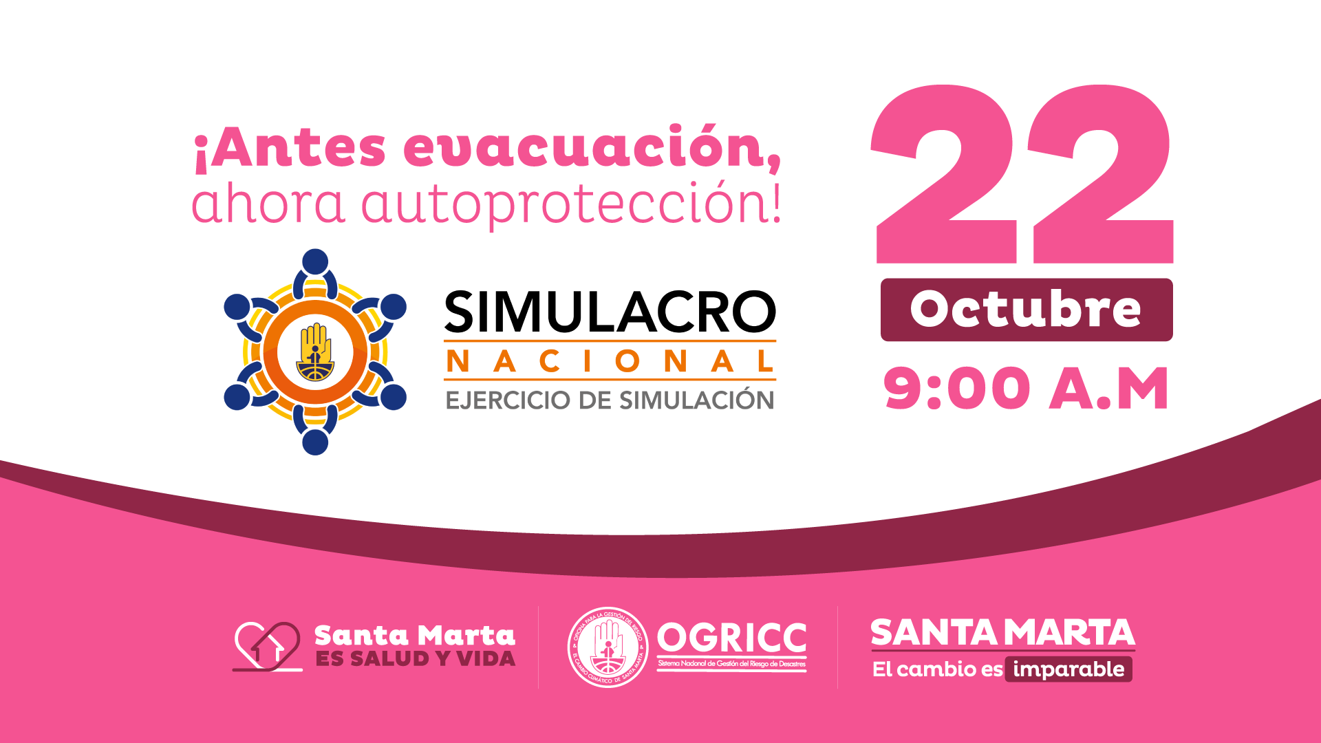 Para este jueves 22 de octubre, a partir de las 9:00 de la mañana, está programado el 'Noveno Simulacro Nacional de Respuesta a Emergencias', actividad a la que se integra la Alcaldía Distrital de Santa Marta, a través de la Oficina para la Gestión del Riesgo y el Cambio Climático (OGRICC).