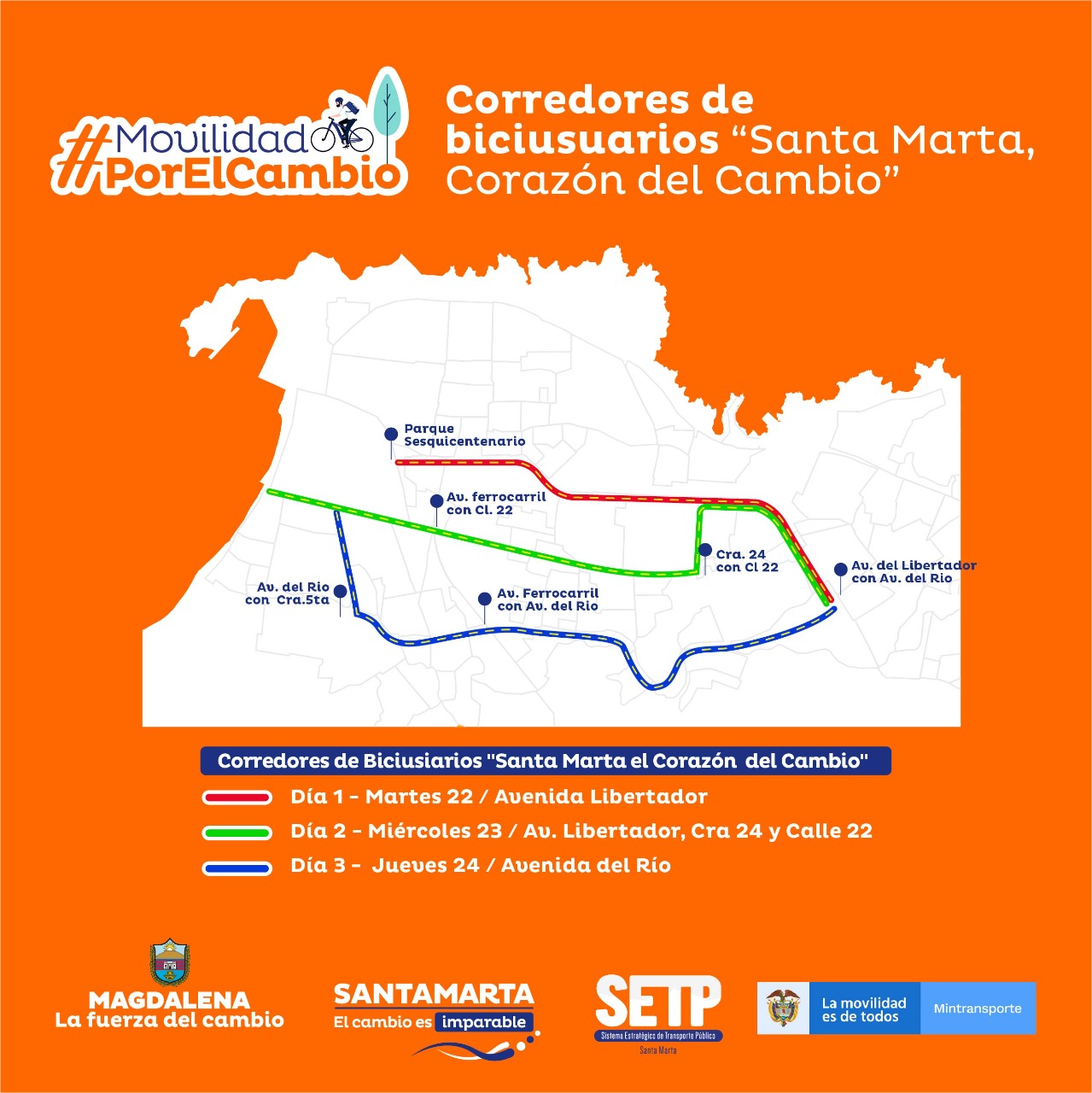 Añadió que el martes 22, el miércoles 23 y el jueves 24 de septiembre, se habilitarán corredores de biciusuarios o ciclorutas denominadas “Santa Marta Corazón del Cambio”, para lo cual se van a habilitar unos carriles en las principales avenidas para que los usuarios se movilicen por ellos de manera preferencial. “La Avenida del Libertador, la avenida del Río y la calle 22 serán los corredores sobre los cuales se habilite un carril exclusivo para el uso de medios no motorizados, para que las personas se desplacen hasta el Centro Histórico o hasta sus lugares de trabajo; el otro carril quedará habilitado en el sentido contraflujo desde las 7:00 de la mañana hasta las 7:00 de la noche”, indicó el secretario de Movilidad.