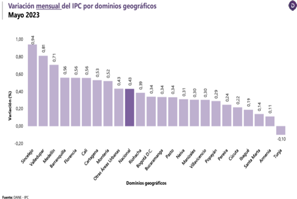 De acuerdo con dicho registro, la ciudad cerró el mes de mayo en el tercer lugar, con un comportamiento de la variación y contribución mensual por divisiones de bienes y servicios de 0,14%, superando la media nacional que fue de 0,43%.