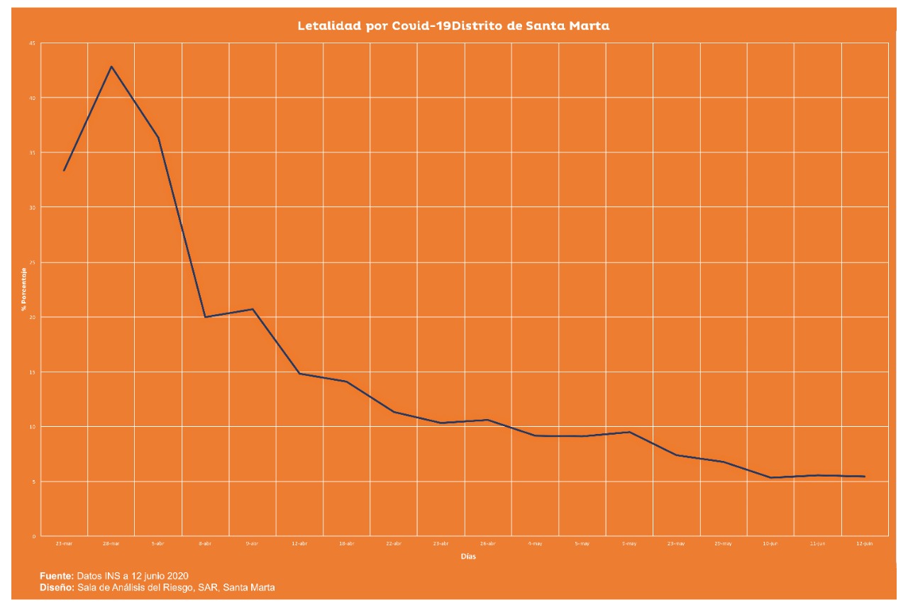 Según el análisis de Javier Hernández Blanco, médico internista, epidemiólogo y miembro del Comité Asesor Científico de la Alcaldía de Santa Marta, la gráfica que relaciona la letalidad del virus en la ciudad, refleja periodos de meseta, lo que indica que el número de fallecidos por COVID-19, se mantuvo estable y pese al leve incremento registrado en los últimos días, la letalidad ha disminuido en el tiempo.