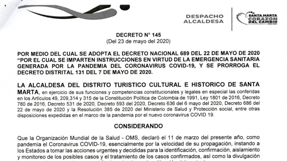 Mediante Decreto la Alcaldía Distrital prorroga medidas de emergencia sanitaria por Covid-19 Mayo 24 de 2020