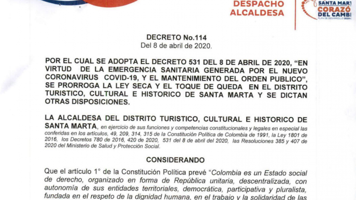 Alcaldía expidió decreto que prorroga la ley seca y toque de queda en el distrito de Santa Marta Abril 15 de 2020