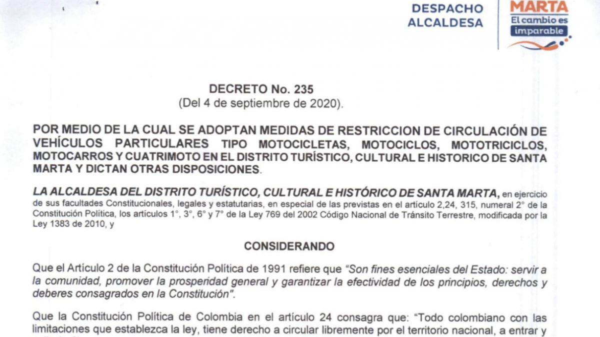 Vuelve el pico y placa para taxis, motocicletas y vehículos particulares en Santa Marta Agosto 31 de 2020